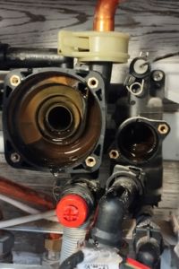 После этого мы промыли котёл — из него вышло очень много грязи. Затем повторно проверили обратный клапан: он снова был загрязнён, поэтому мы его ещё раз разобрали и промыли.